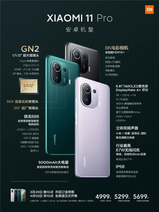 小米11 Pro 8GB+128GB版4999元,8GB+256GB版5299元,12GB+256GB版5699元;小米11 Ultra 8GB+256GB版5999元,12GB+256GB版6499元,12GB+512GB版6999元;第三代旗艦Wi-Fi6小米路由器AX9000售價(jià)999元;“國民智能手環(huán)”新作小米手環(huán)6,標(biāo)準(zhǔn)版229元,NFC版279元;以上產(chǎn)品3月29日開啟訂金預(yù)售,線下全款預(yù)售,4月2日10點(diǎn)首銷;小米11青春版8GB+128GB版2299元,8GB+256GB版2599元,3月29日開啟訂金預(yù)售,4月16日10點(diǎn)首銷。