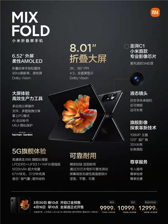 從開(kāi)啟預(yù)售至今,小米折疊屏MIX FOLD已成為眾多機(jī)友關(guān)注的焦點(diǎn)。其強(qiáng)勁的實(shí)力以及標(biāo)準(zhǔn)版12+256售價(jià)9999元、12+512版10999元、陶瓷特別版16+512售價(jià)12999元的價(jià)格讓人十分驚喜。4月16日上午10點(diǎn),這款讓人“久等”的小米折疊屏MIX FOLD終于正式發(fā)售,喜歡大屏的小伙伴歡迎入手嘗鮮。