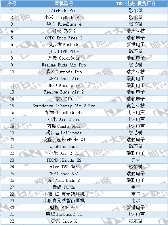 從去年6月初至今13個月,旭日大數(shù)據(jù)圖解了17個TWS耳機(jī)品牌32款TWS明星產(chǎn)品,拆解32款TWS明星產(chǎn)品后,TWS耳機(jī)硅麥梯隊(duì)分級昭然顯現(xiàn)。