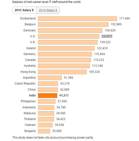 而排在前三位的分別是瑞士、比利時(shí)和丹麥,其IT專業(yè)人員的平均薪分別為171465美元、152980美元和139920美元。IT薪水排名最低的三個(gè)國家是泰國、越南和保加利亞,其IT專業(yè)人員的平均薪分別為34423美元、30938美元和25680美元。