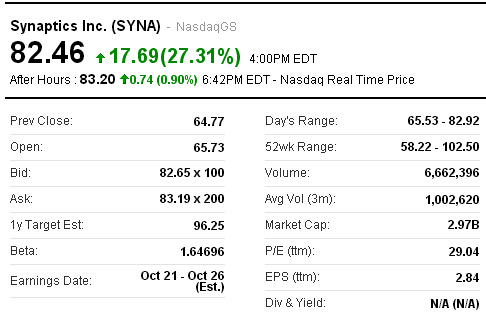 盡管如此,本月Synaptics公司股價(jià)已從6月份的100美元以上跌至不足70美元水平,當(dāng)然,這歸咎于全球個(gè)人電腦和手機(jī)銷售將出現(xiàn)放緩預(yù)測(cè)。以周三收盤(pán)價(jià)計(jì),該公司市值約為29.7億美元。