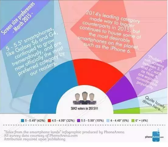 外媒PhoneArena近日針對網(wǎng)站讀者對手機(jī)尺寸的喜好進(jìn)行了投票調(diào)查,發(fā)現(xiàn)今年的結(jié)果與往年存在很大差異。數(shù)據(jù)顯示,共有43%的用戶投票選擇了5至5.49英寸的選項(xiàng),而選擇6英寸的僅有4%,相比2014年、2013年,用戶對5.5英寸及以上大屏手機(jī)的興趣銳減。