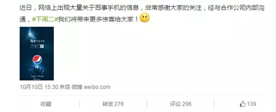 據(jù)上周消息,一個疑似百事官方的名叫@百事手機的微博開通,并認證為“IT/互聯(lián)網(wǎng)/電子產(chǎn)品-手機廠商“,深圳玩瘋科技有限公司。該賬號稱,經(jīng)與合作公司內(nèi)部溝通,今日將帶來更多驚喜給大家。