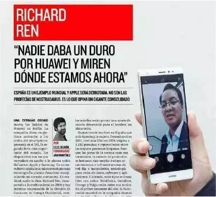 “華為消費者BG西歐地區(qū)部總裁任宏亮專訪”本周發(fā)表在西班牙首家商業(yè)雜志ActualidadEconómica上。該雜志屬于UnidadEditorial旗下,擁有5萬讀者,主要受眾是經(jīng)濟界和政界的決策者。該欄目主要刊登對管理人員和公司董事的廣泛深度訪談,而這是該欄目首次把注意力轉(zhuǎn)向一位科技公司領(lǐng)導(dǎo)。這篇文章除了關(guān)注華為在柏林國際消費類電子產(chǎn)品展覽會上發(fā)布的消息以外,還介紹了消費者業(yè)務(wù)集團的發(fā)展,戰(zhàn)略,以及未來幾個月的預(yù)測,尤其是在歐洲和西班牙市場的預(yù)測。