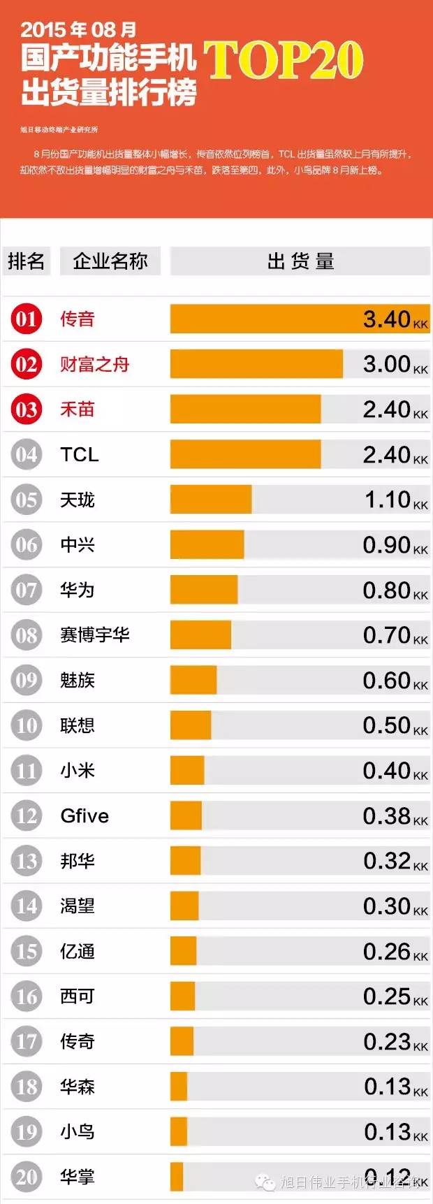 2015年08月國產(chǎn)功能手機(jī)出貨量排行榜