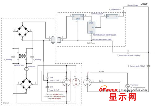 對(duì)于許多便攜式設(shè)備來說,電池充電器構(gòu)成觸摸屏主要的干擾來源。當(dāng)操作人員手指接觸觸摸屏?xí)r,所產(chǎn)生的電容使得充電器干擾耦合電路得以關(guān)閉。充電器內(nèi)部屏蔽設(shè)計(jì)的質(zhì)量和是否有適當(dāng)?shù)某潆娖鹘拥卦O(shè)計(jì),是影響充電器干擾耦合的關(guān)鍵因素。