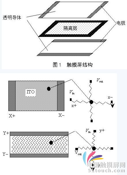 典型觸摸屏的工作部分一般由三部分組成,如圖1所示:兩層透明的阻性導(dǎo)體層、兩層導(dǎo)體之間的隔離層、電極。阻性導(dǎo)體層選用阻性材料,如銦錫氧化物(ITO)涂在襯底上構(gòu)成,上層襯底用塑料,下層襯底用玻璃。隔離層為粘性絕緣液體材料,如聚脂薄膜。電極選用導(dǎo)電性能極好的材料(如銀粉墨)構(gòu)成,其導(dǎo)電性能大約為ITO的1000倍。