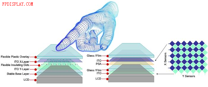 電阻式觸控屏包括有一個(gè)柔性頂層,然后是一層ITO,一個(gè)空氣隙,然后是另一層ITO。面板有4根線附到ITO層上:“X”層的左右側(cè)各一根,“Y”層的頂端和底端各一根。